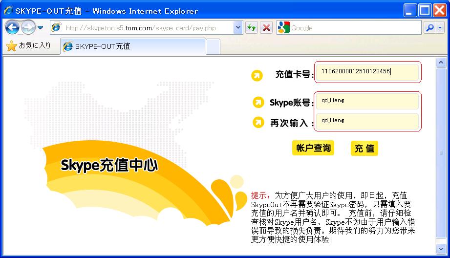 1、打开Tom-skype官方充值网址 http://skypetools5.tom.com/skype_card/pay.php